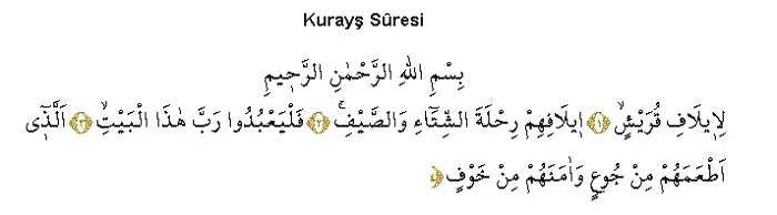 Bismillahirrahmânirrahîm. 1- Li’îlâfi Kurayş, 2- Îlâfihim rıhleteşşitâi vessayf, 3- Felya’büdû rabbe hâzel beyt, 4- Ellezî et’amehüm mincû’in ve âmenehüm min havf.